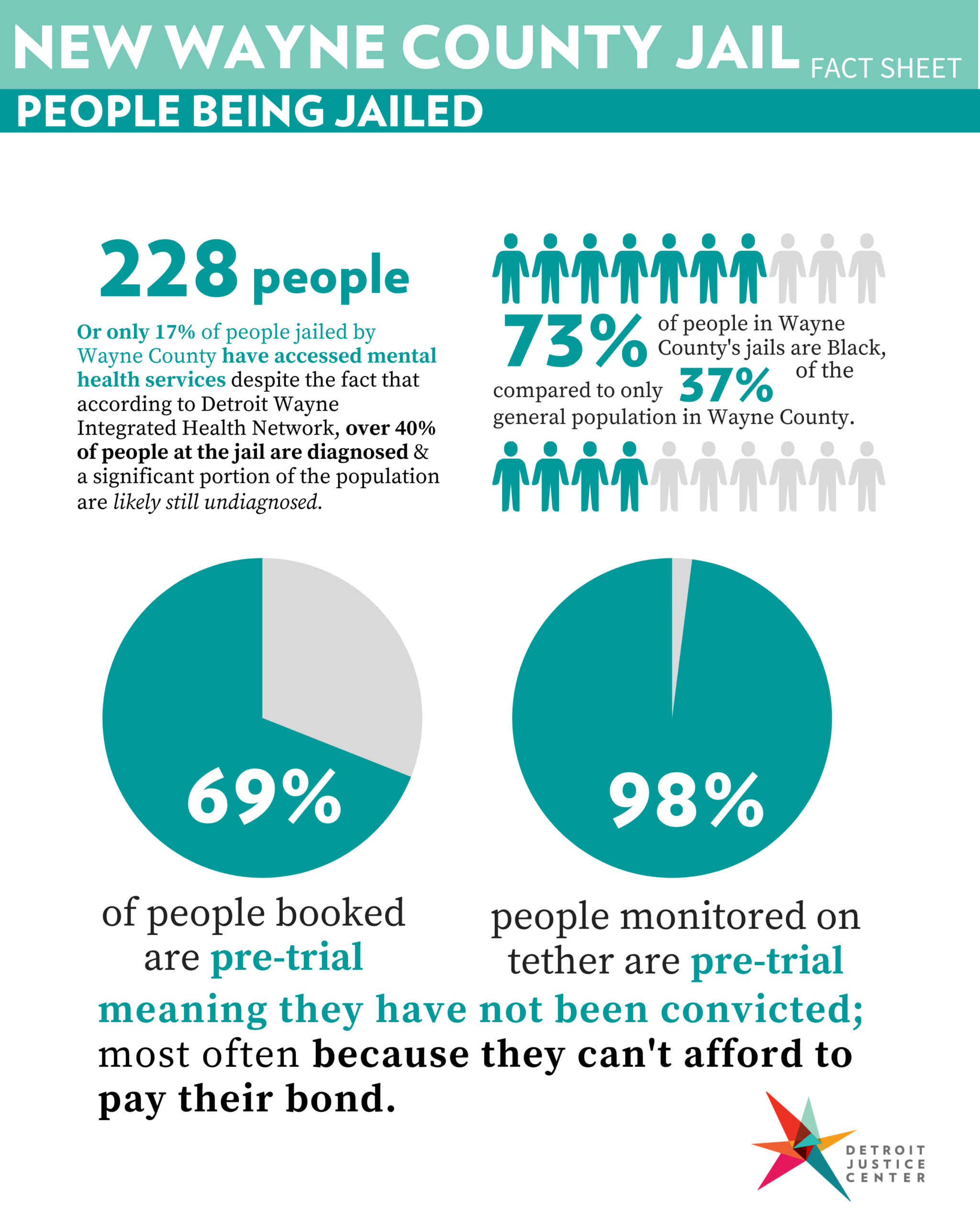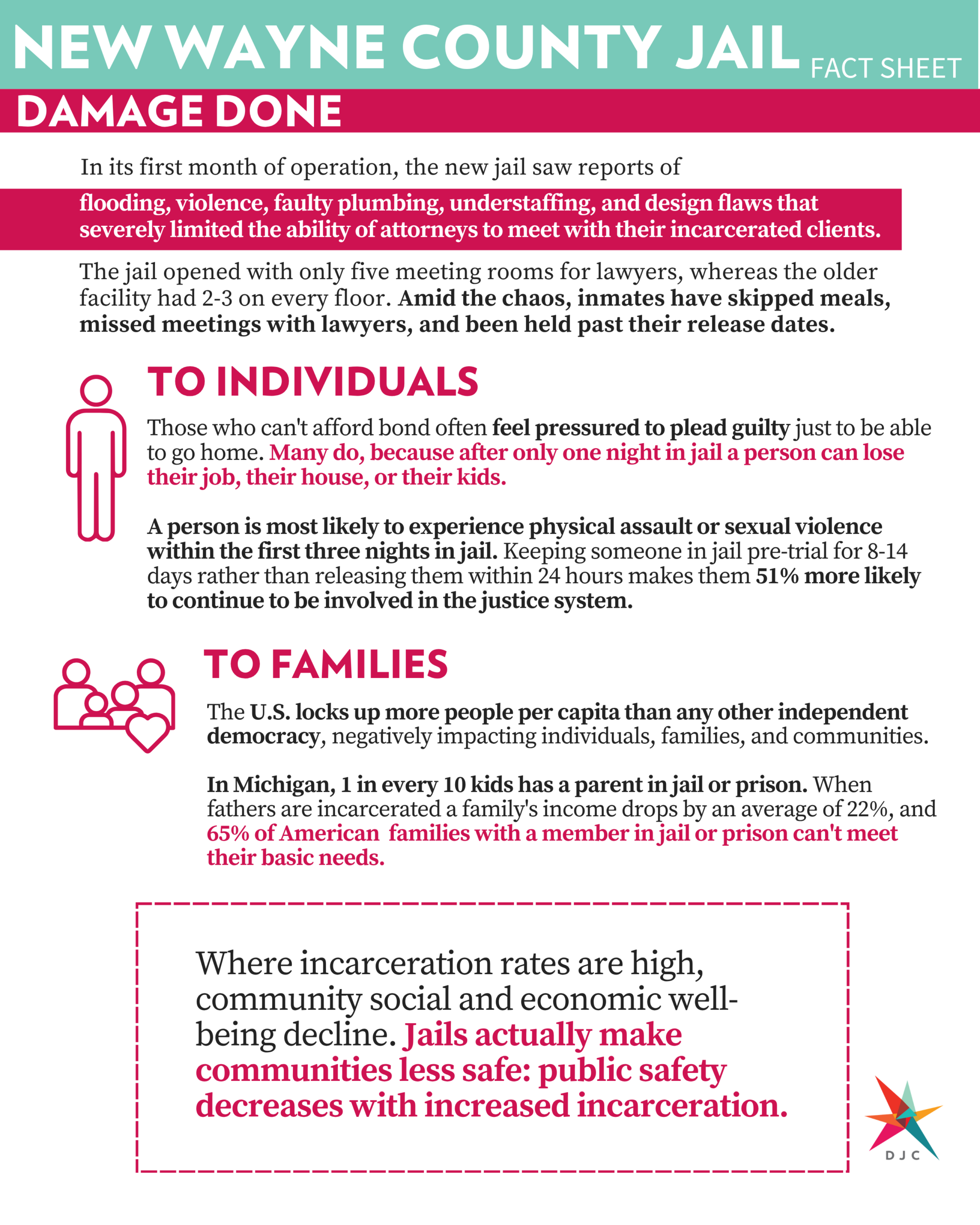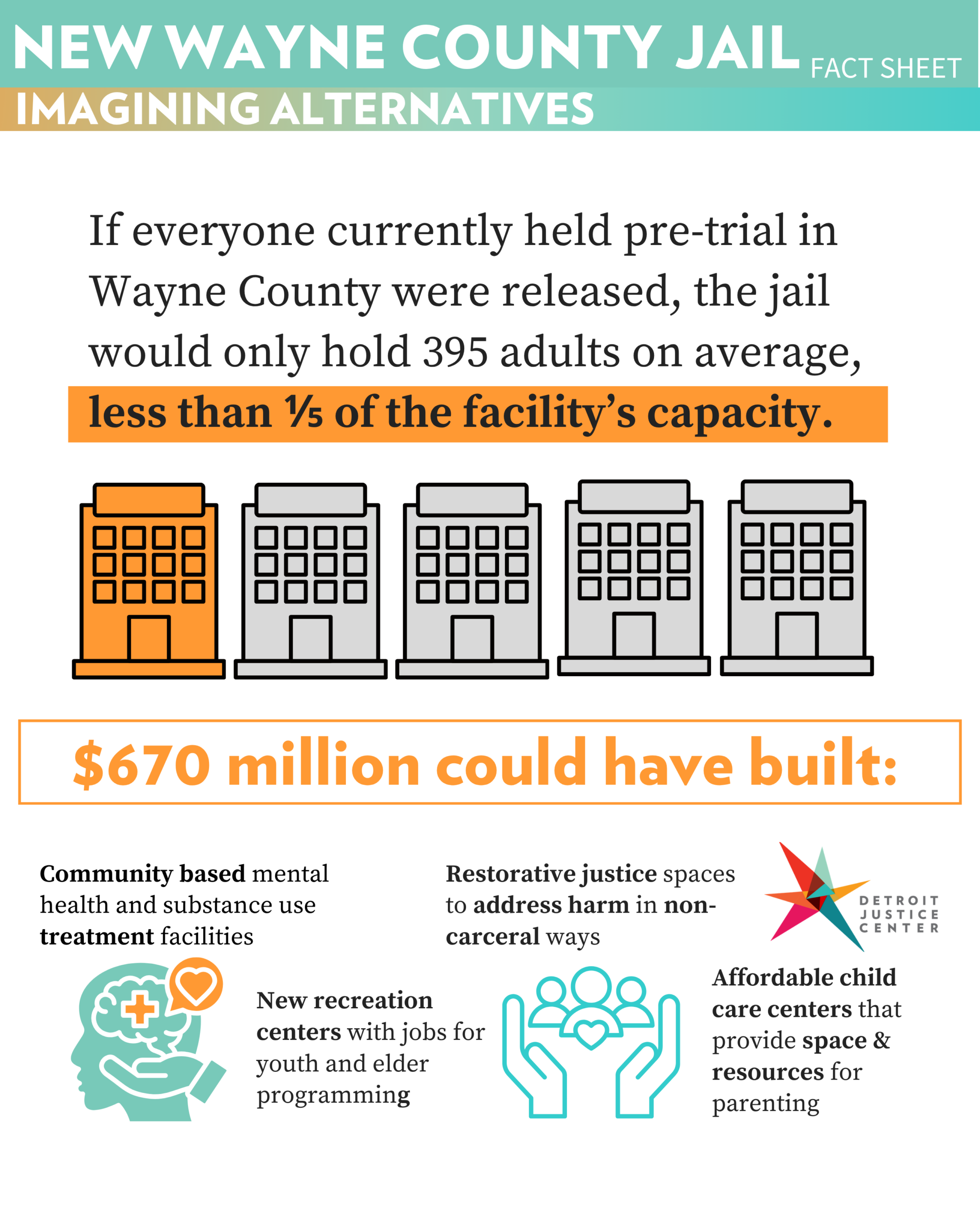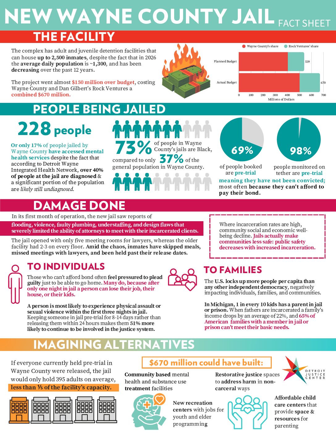 Wayne County has built a $670-million dollar complex that went almost $150 million over budget, including a new jail. Our fact sheet includes information on the jail project, data on the harms jails cause to individuals, families, and communities, and ideas for possible alternatives.